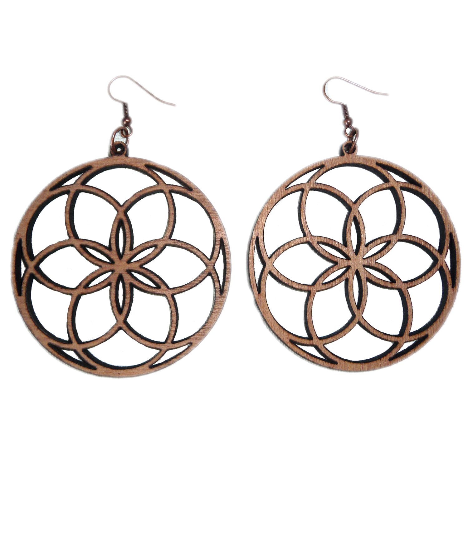 MAHOGANY WOOD LASER CUT EARRINGS WOOD AND COPPER FLOWER OF LIFE