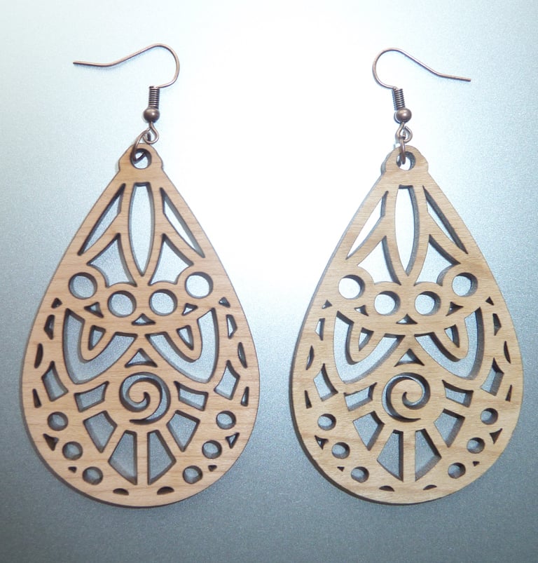 CHERRY WOOD LASER CUT EARRINGS TRIBAL WITH ANTIQUE COPPER HOOKS