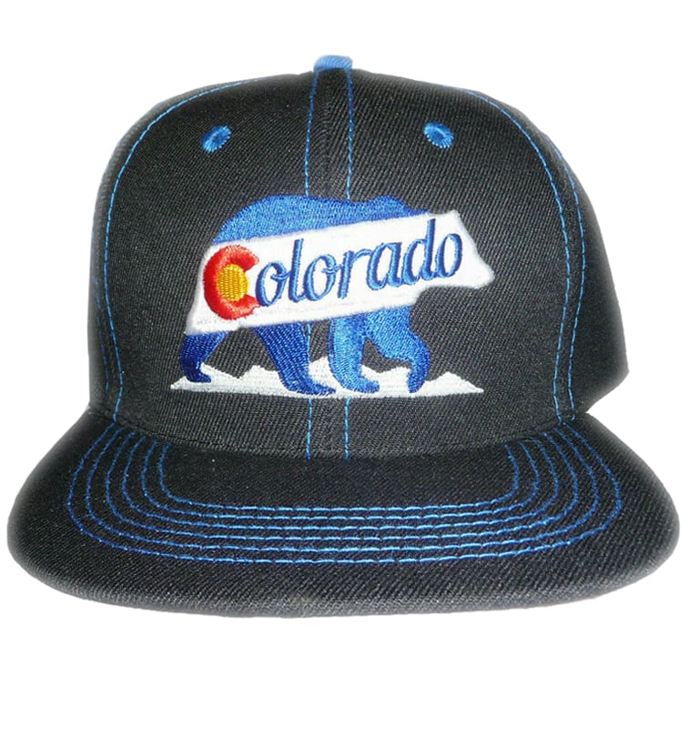 Stylish Colorado State snapback hat. Blue stitching accents with front and back Colorado embroidery.