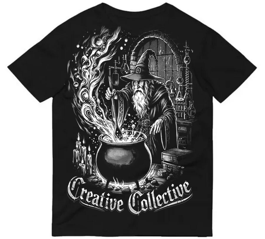 Step into a world where creativity meets mystique. The Edifice Creative Collective Short sleeve tee blends bold streetwear with an arcane edge—featuring a clean, iconic front crest logo and a striking back illustration of a master alchemist at work.