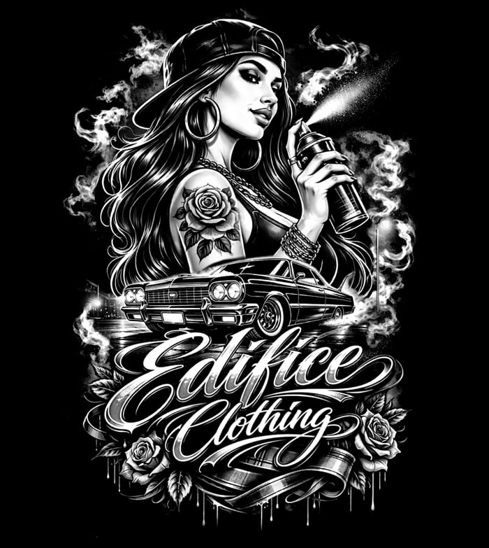 Rendered in a high-contrast, Streetwear-inspired style, the artwork feels etched rather than printed—like it’s been carved straight into the fabric. The custom “Edifice Clothing” script flows beneath with smooth, lowrider-style elegance, tying street culture, art, and identity into one clean hit.