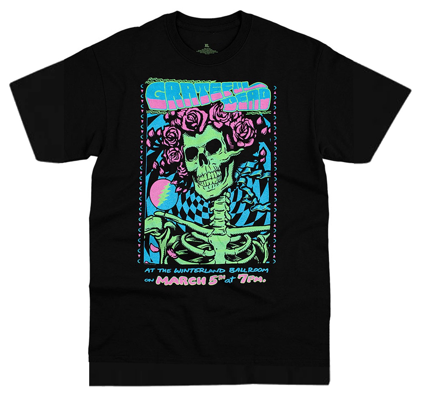 Officially Licensed Grateful Dead Graphic T-Shirt, Tee designed and printed in the USA. This graphic tee is printed with glow in the dark ink. Making your next black light party a guaranteed hit.