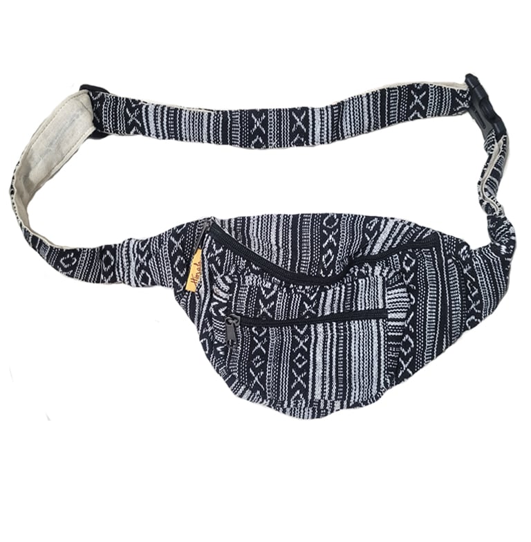 100% pure hand woven cotton black and white pattern Color money belt (Fanny Pack) handmade in Nepal. This product can be use by both men and women vest or can be worn lower on the hips. This bag has charming features, it is practical and versatile because it can be belt bag/fanny pack /shoulder bag, it has 3 pockets with zippers, the belt is adjustable 29 - 45 inch which can make shorter and longer as well. Fair trade product. Size: 29 x14x10 cm (12.5x5.5x4 inches)