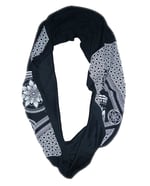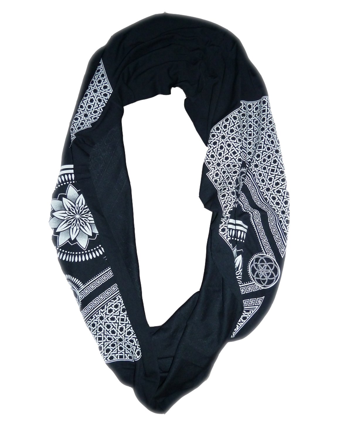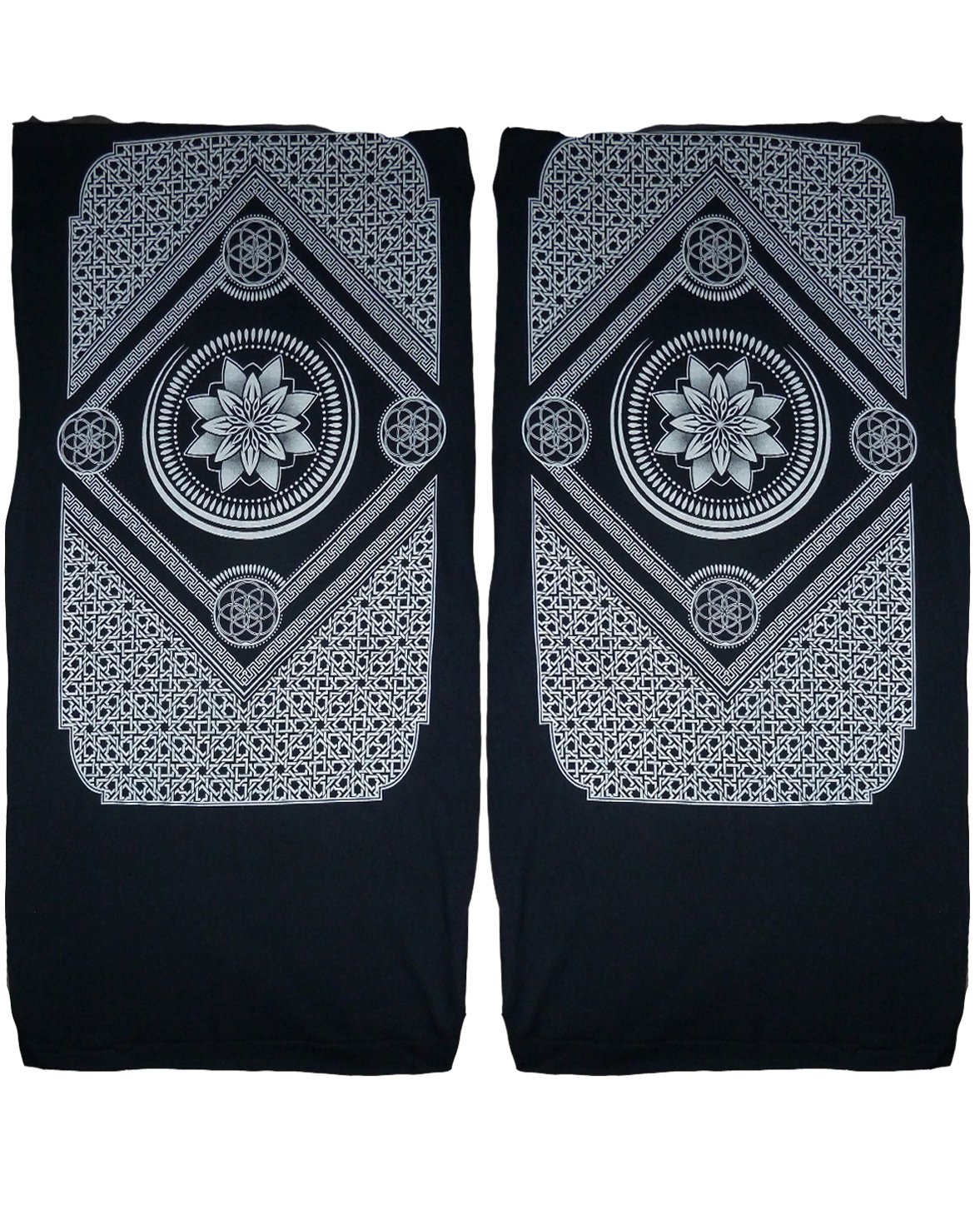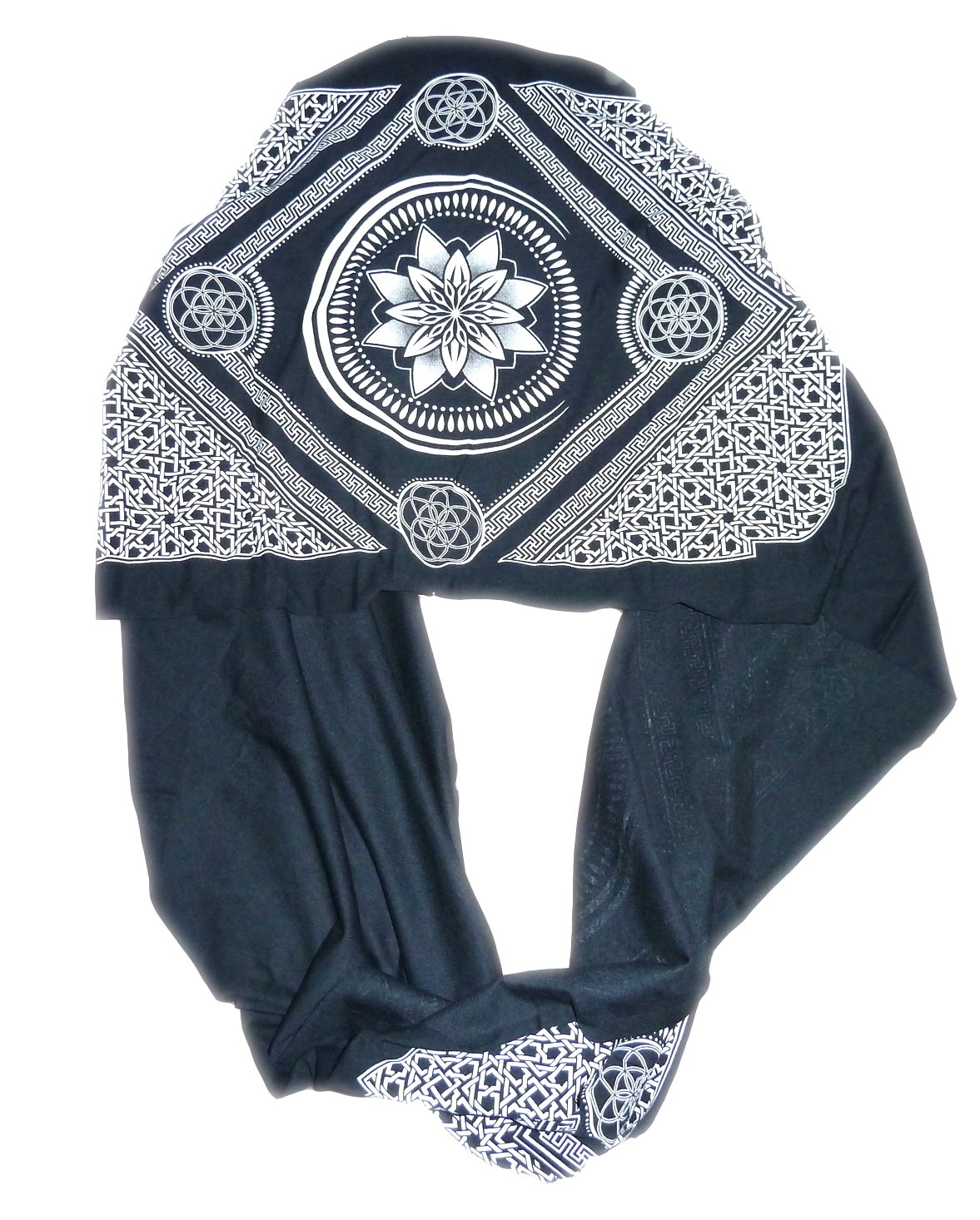 Dark Navy blue Bamboo and organic cotton blend tubular fabric. Professionally screen printed with white ink sacred eternal geometry design. There are two identical prints, so if worn as a hood the design can be seen on both the right and left side. Client favorite!