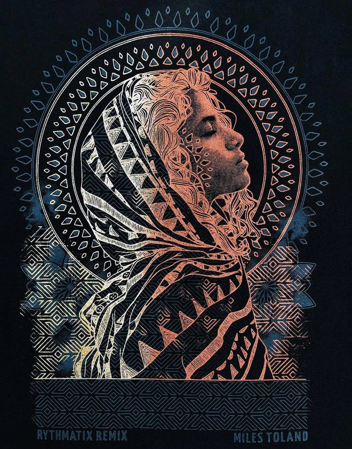"Miles Toland’s surreal paintings capture the mysterious places we visit between sleeping and waking. He invites the viewer into this liminal space by blending familiar elements of our objective world with ethereal textures and geometric patterns. The mandalas and the organic fluidity of wood grain suggest the subjects’ energy extending beyond their physical bodies and into the realm of spirit."